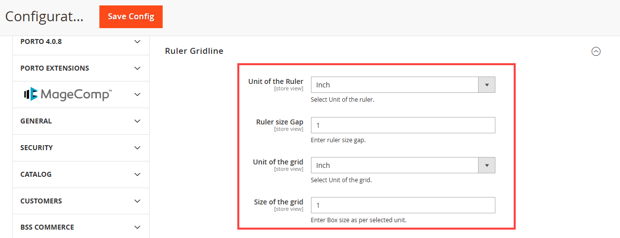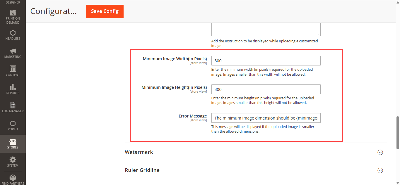 Navigate to STORES → Configuration, you can configure the various features of the Product Designer Tool. Now, scroll down to the Ruler Gridline section and do the following configurations. [2]