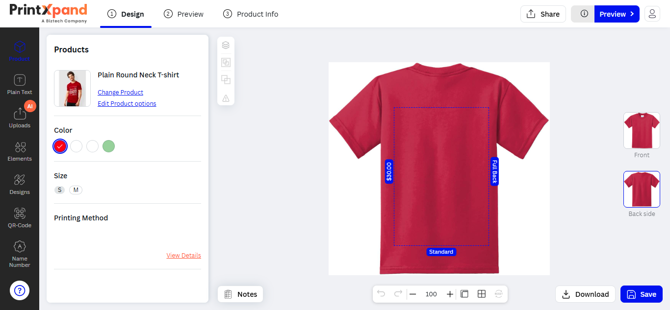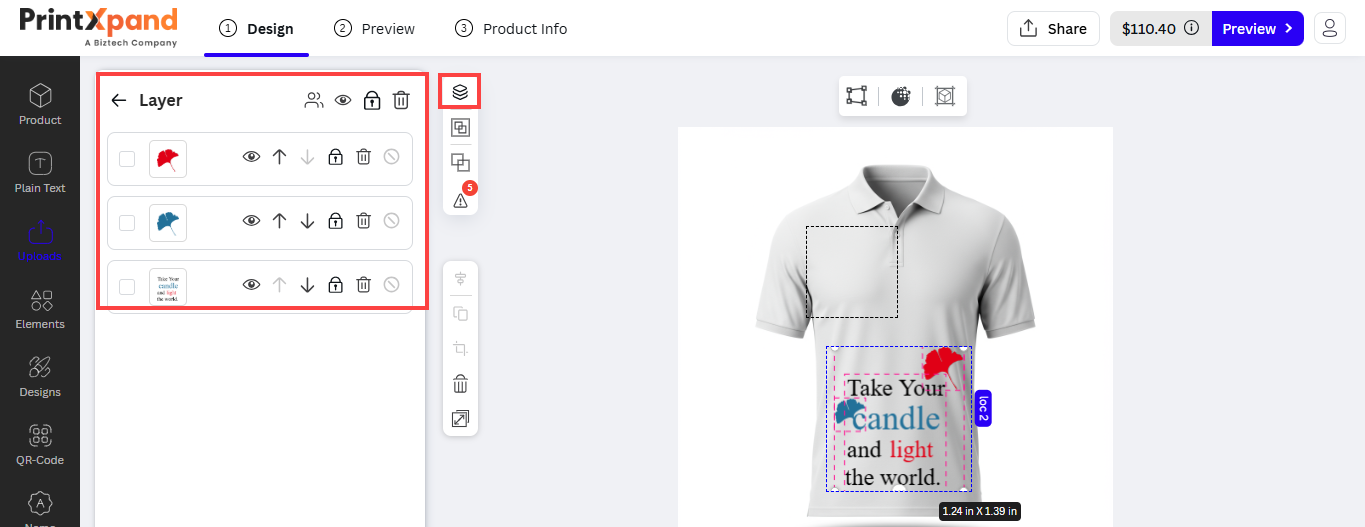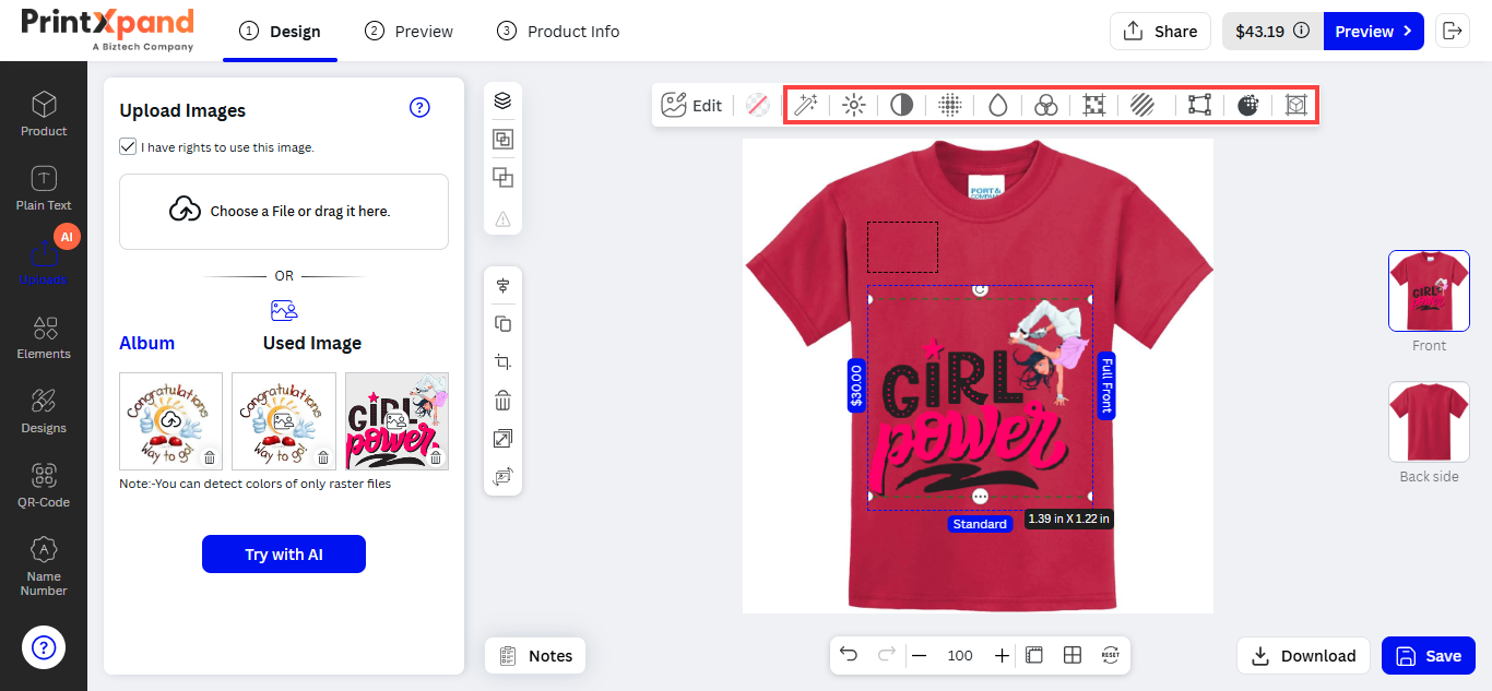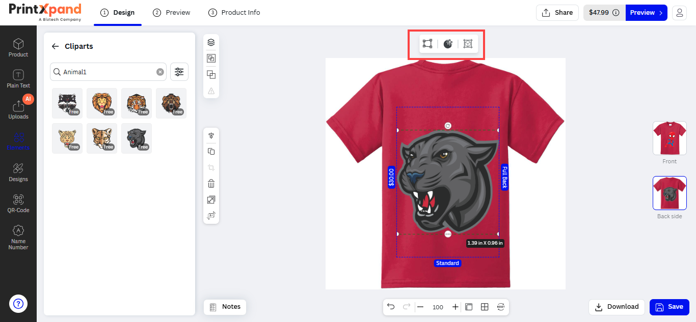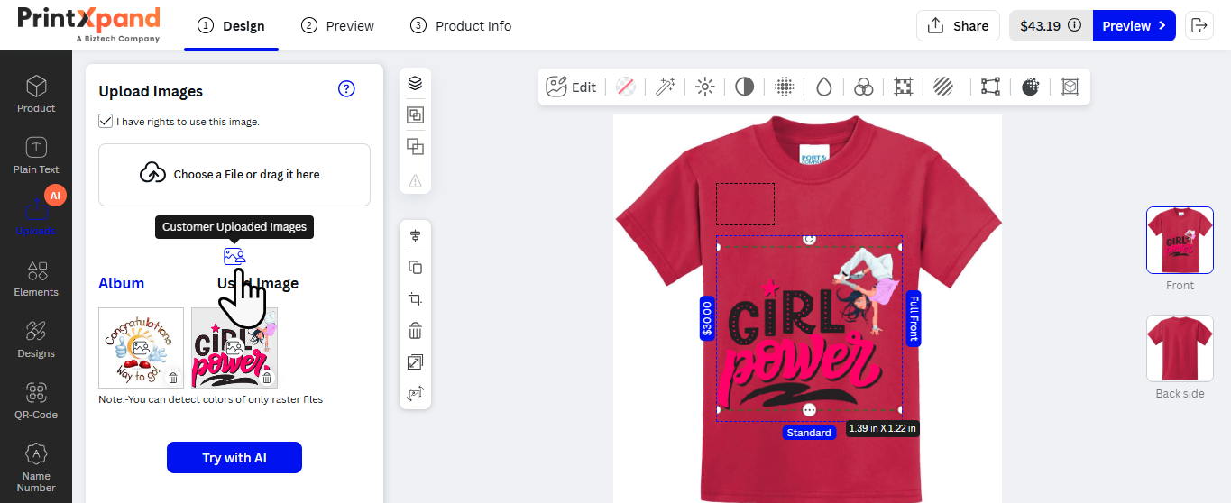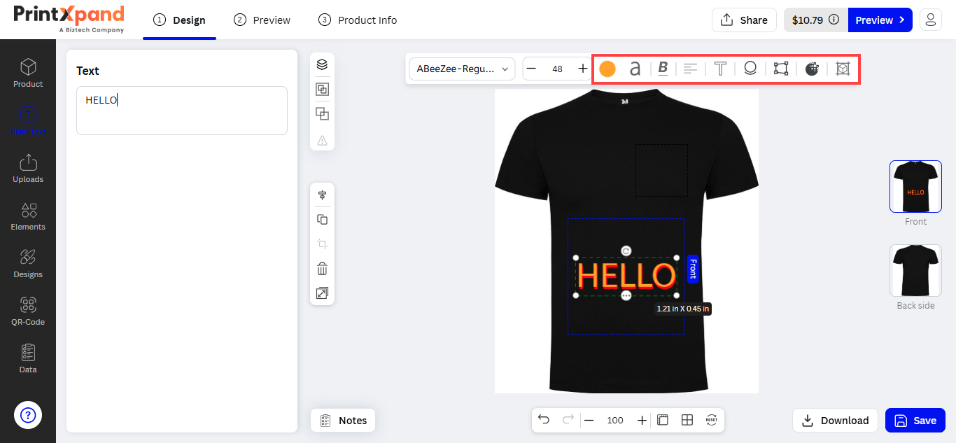 After inserting the text, the customers can see the designer tool in the sub-menu. The customers can customize the Font Size, Style, Color, and text alignment.