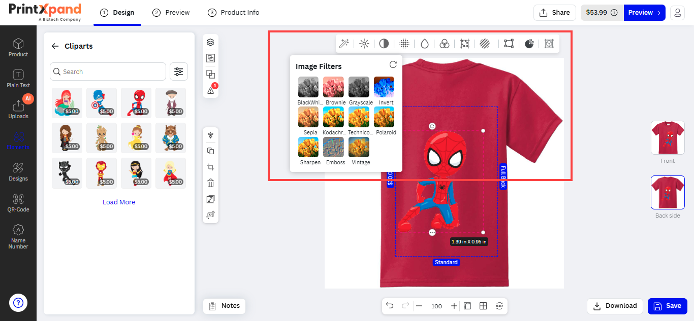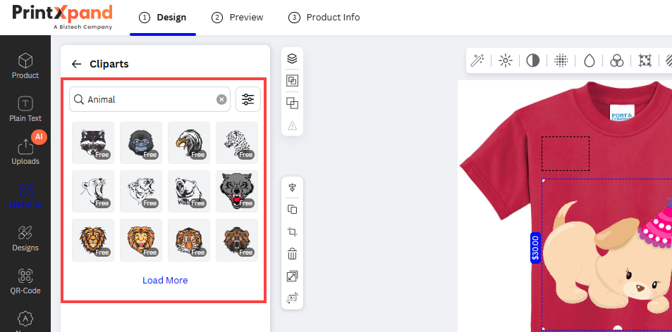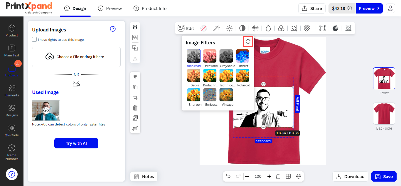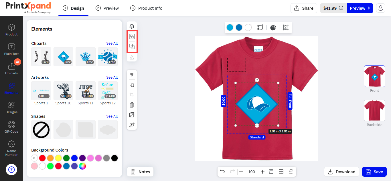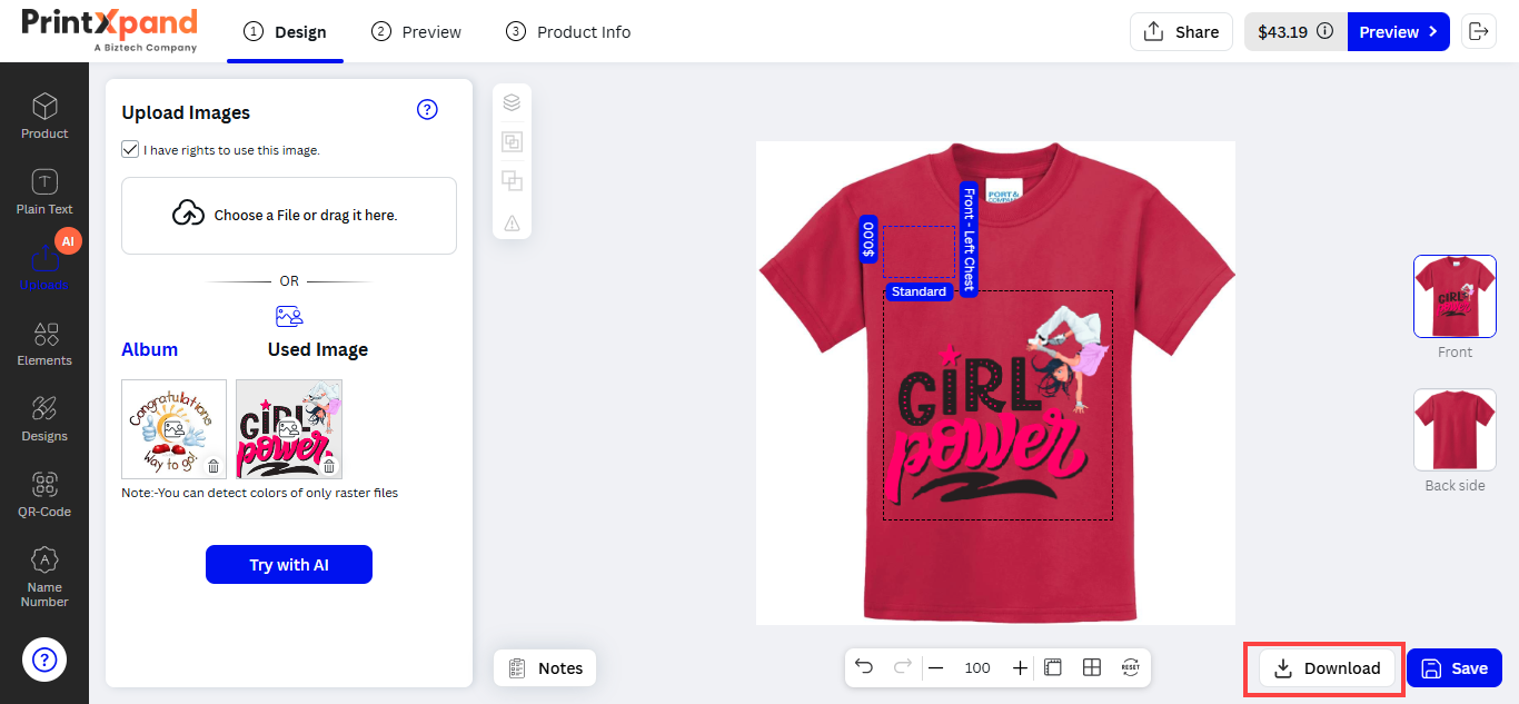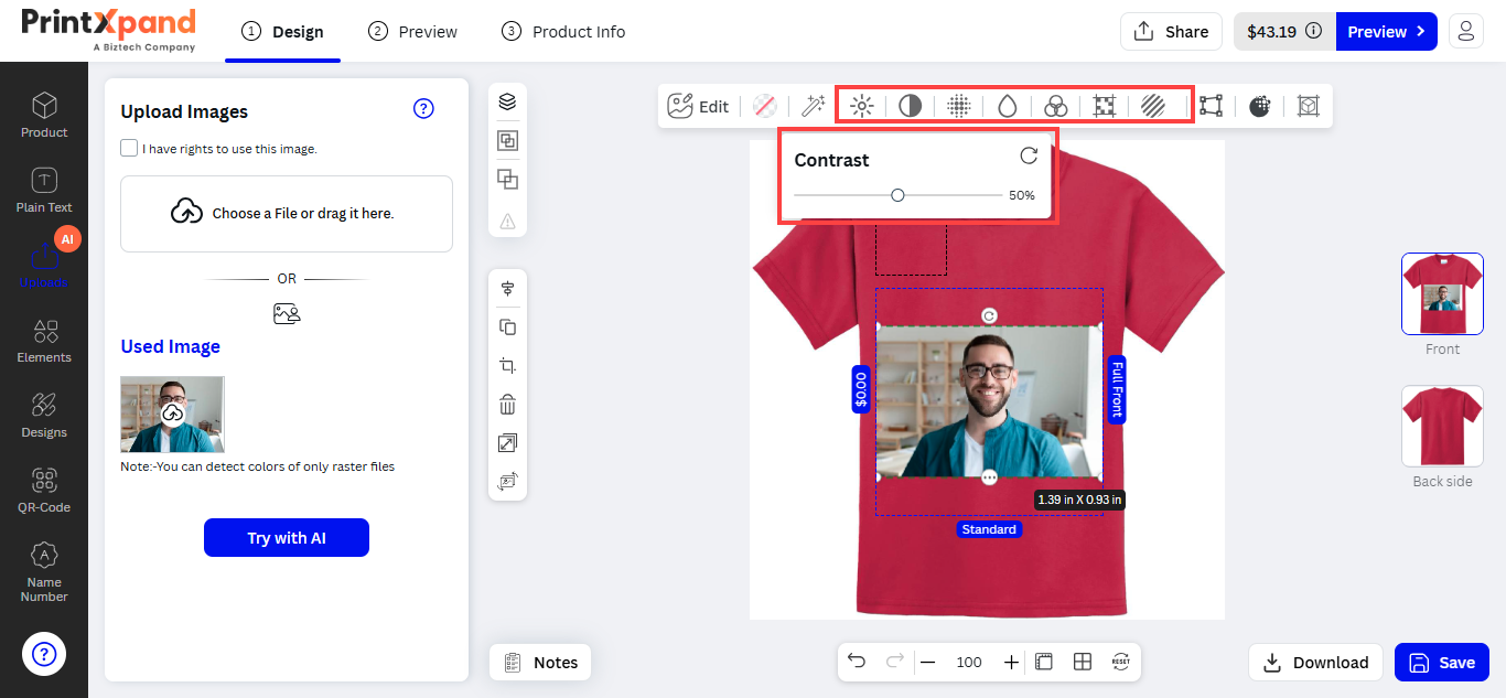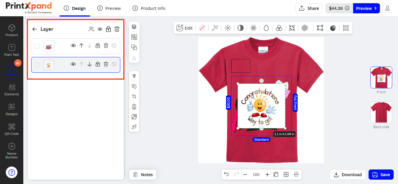 After inserting the text, the customers can see the designer tool in the sub-menu. The customers can customize the Font Size, Style, Color, and text alignment.