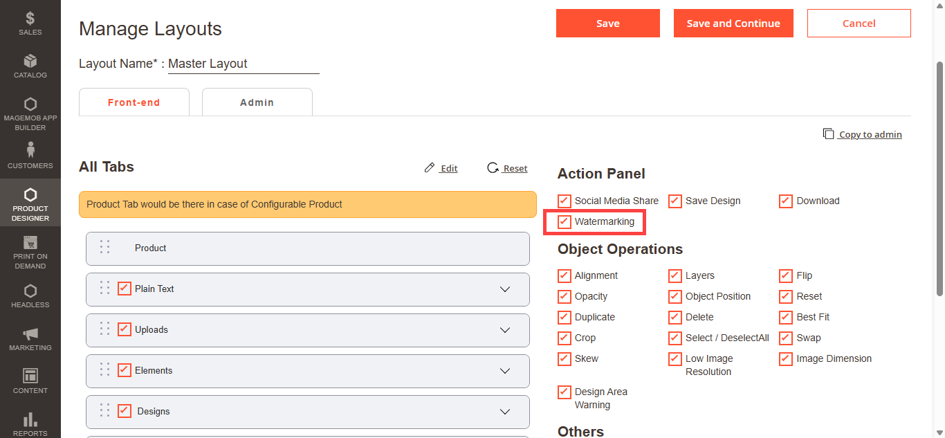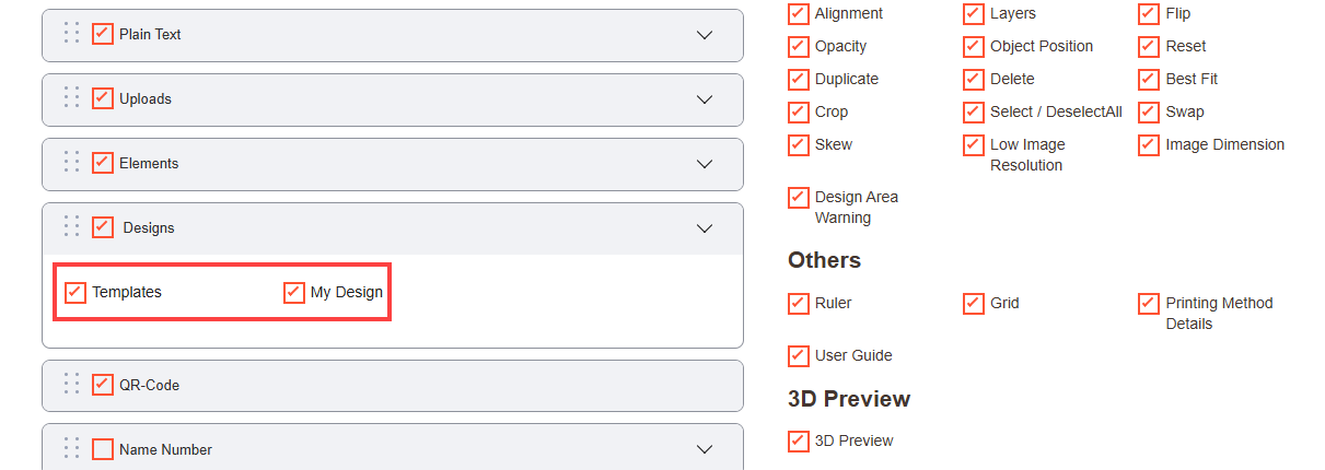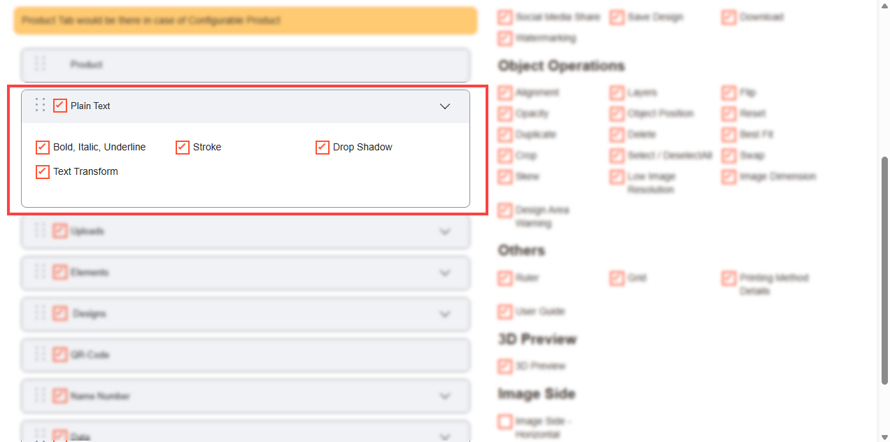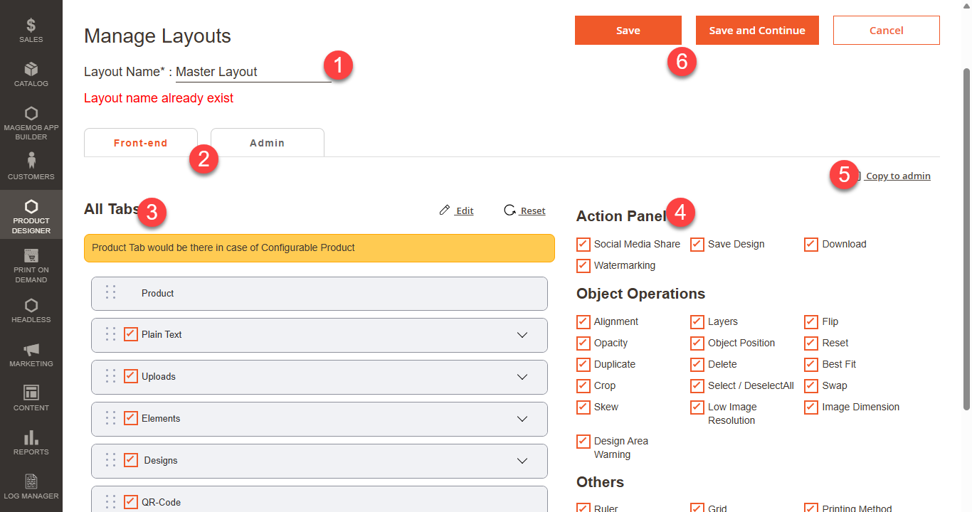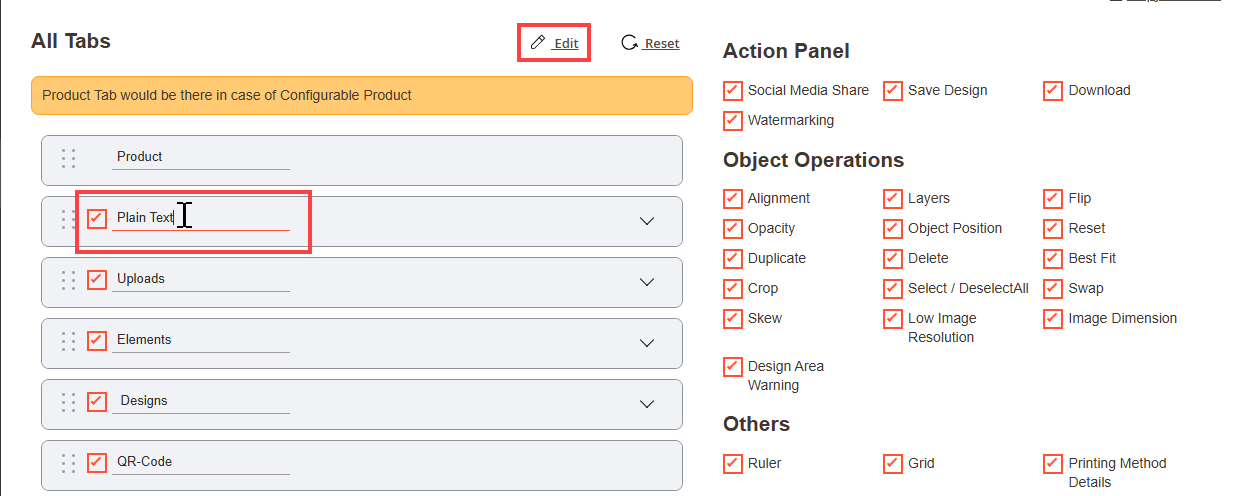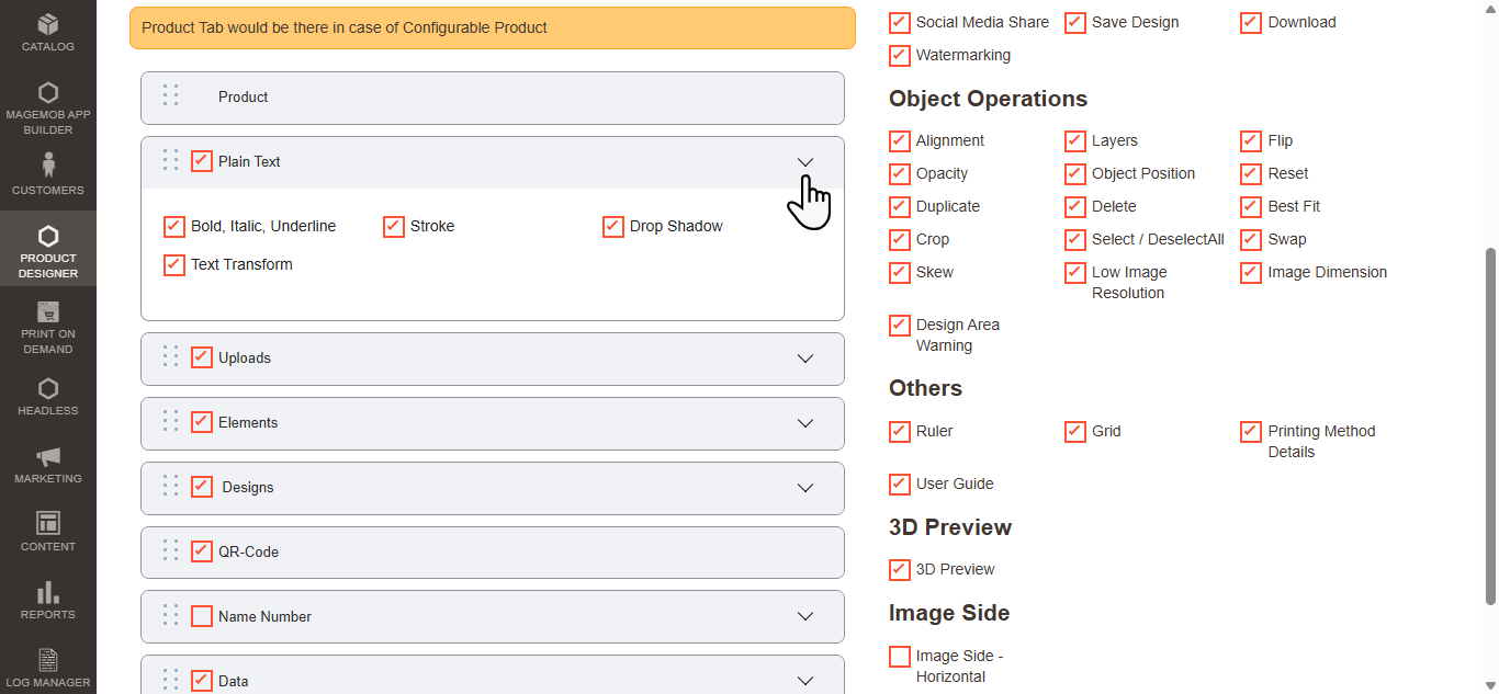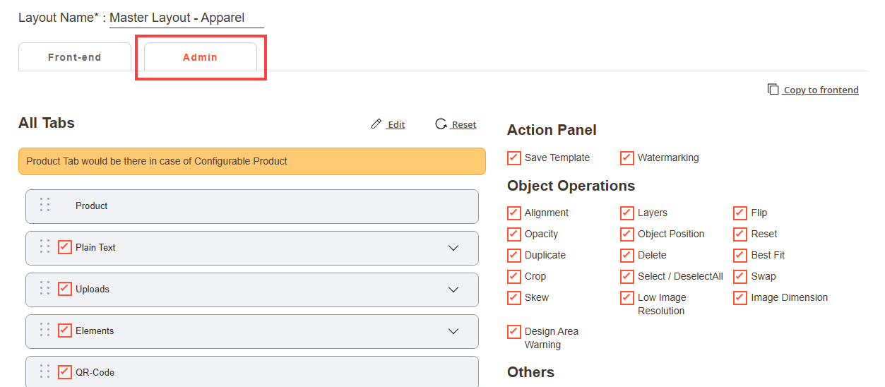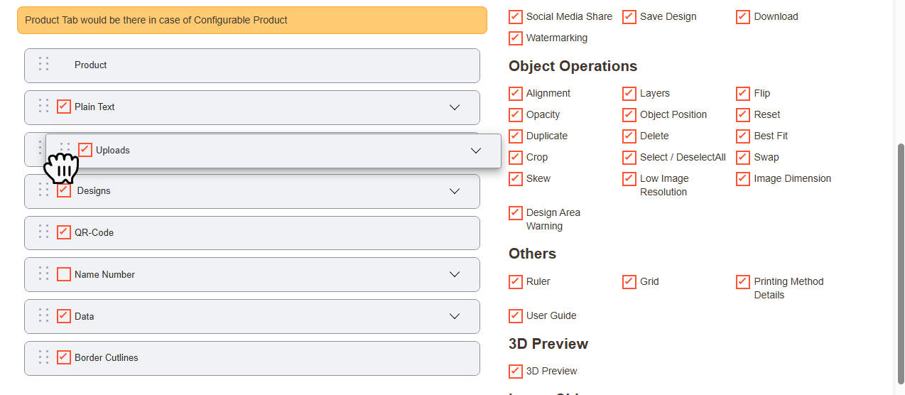 Navigate to the Product Designer > Manage Layouts to manage the Designer Tabs and enable the required features for the designing tool.[1]