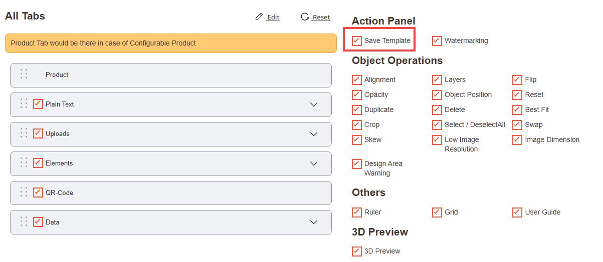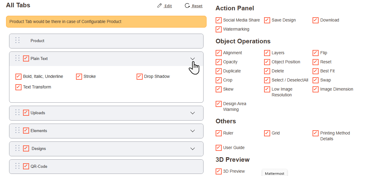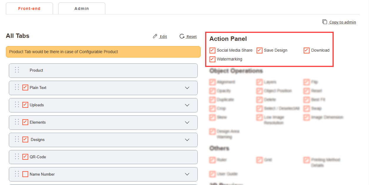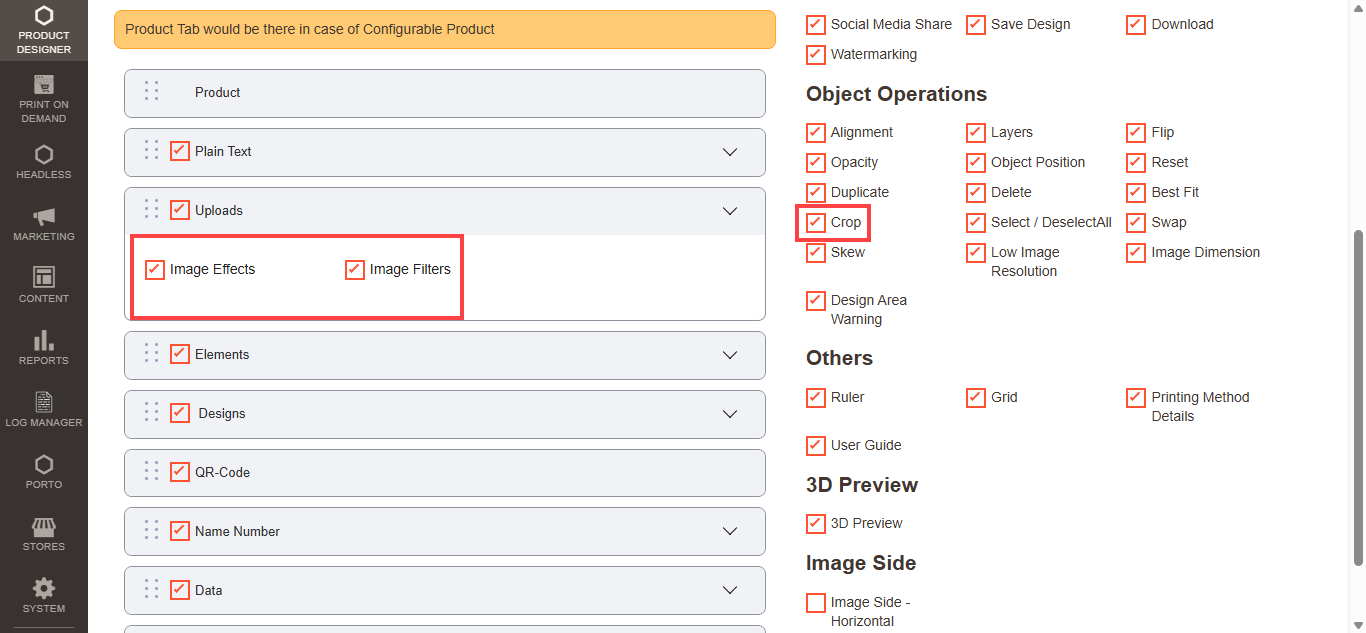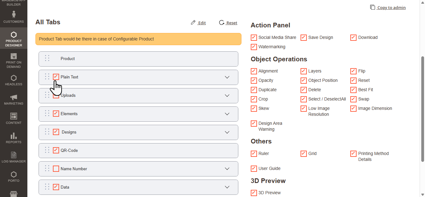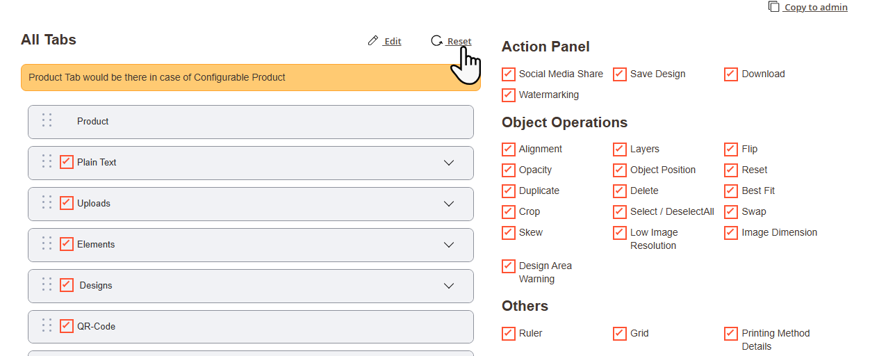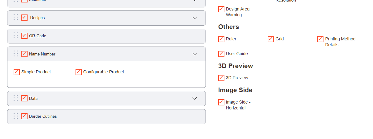 Navigate to the Product Designer > Manage Layouts to manage the Designer Tabs and enable the required features for the designing tool.[1]