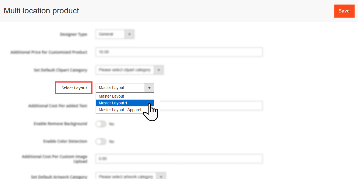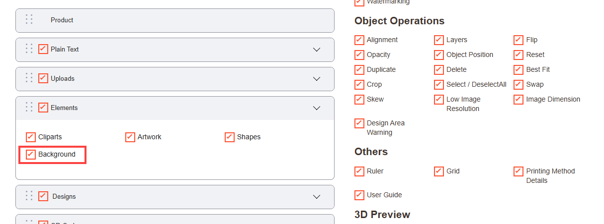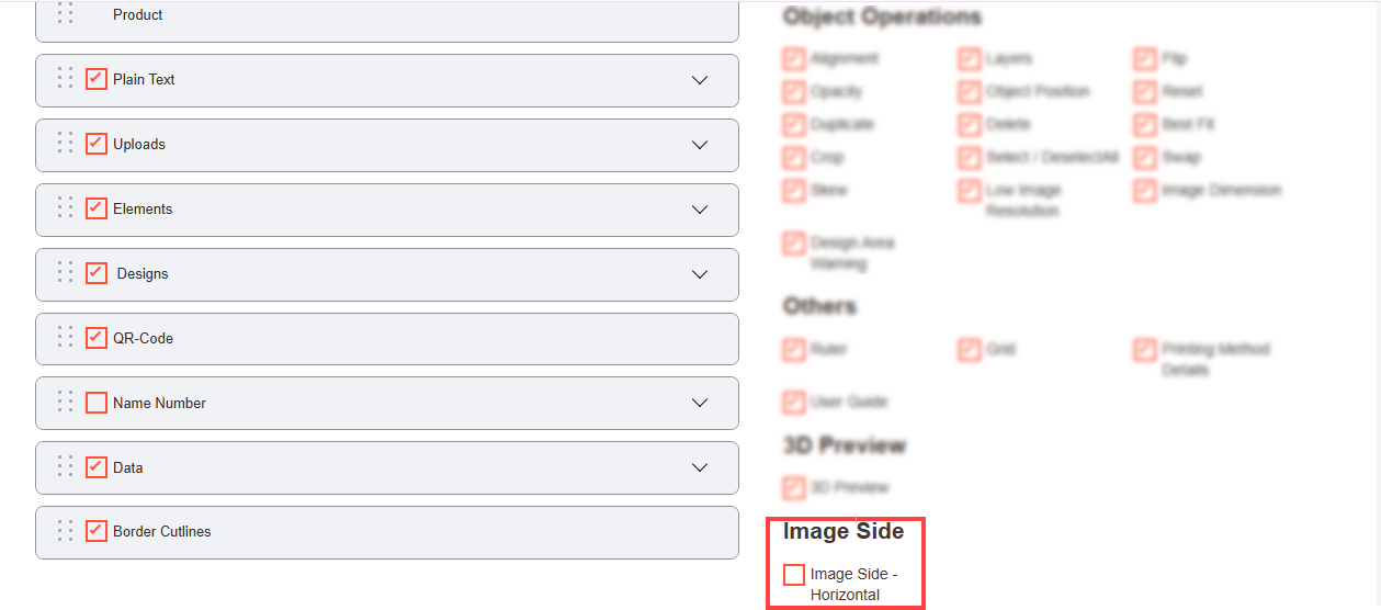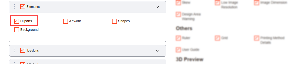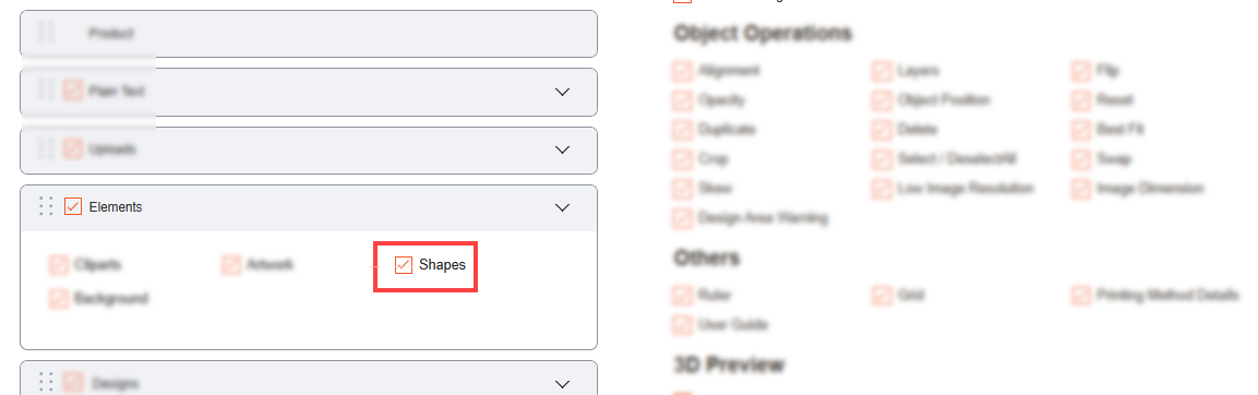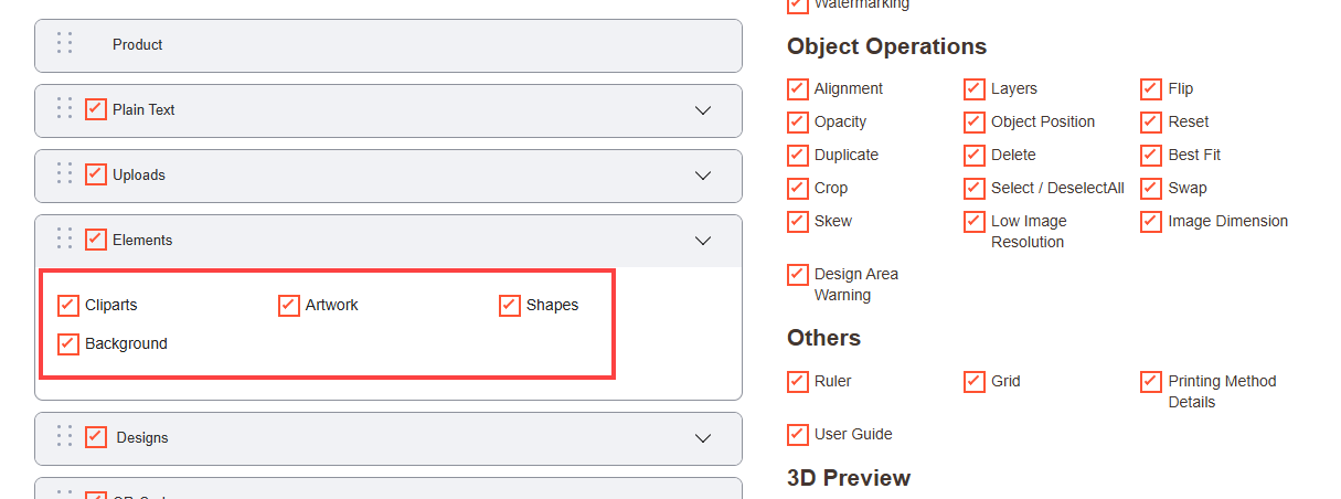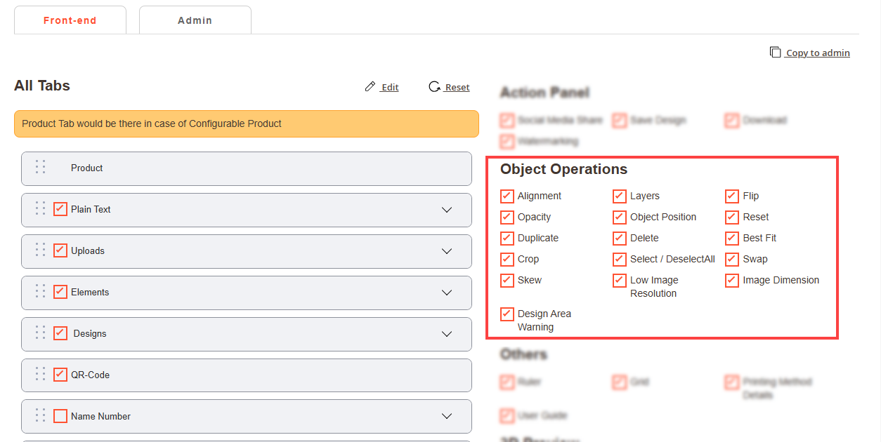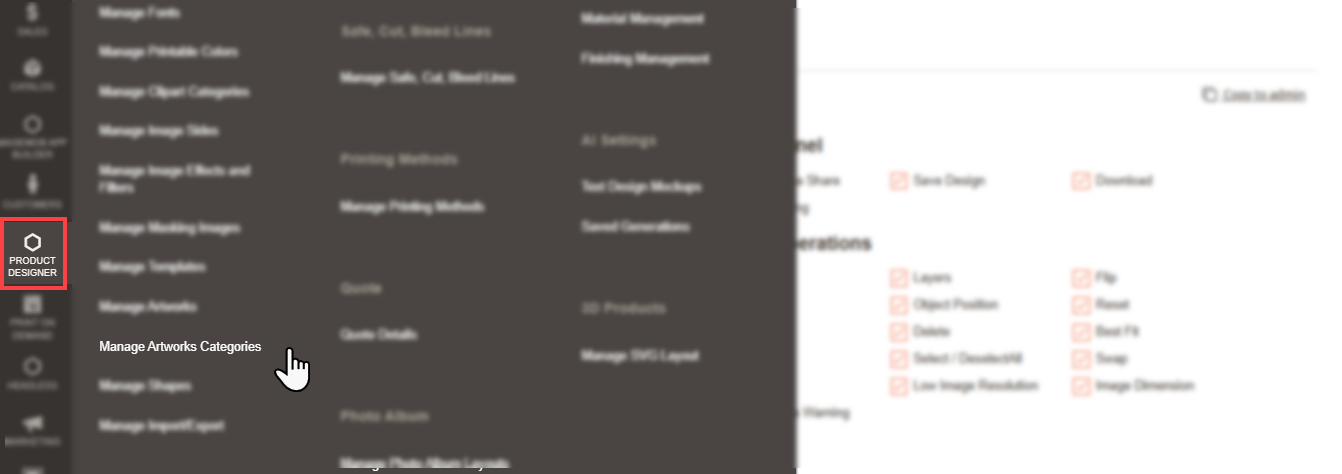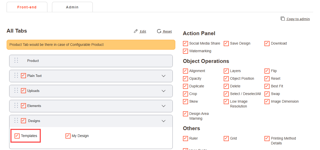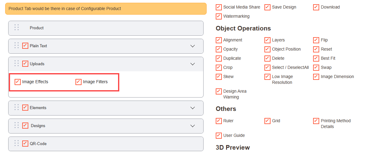 Navigate to the Product Designer > Manage Layouts to manage the Designer Tabs and enable the required features for the designing tool.[1]