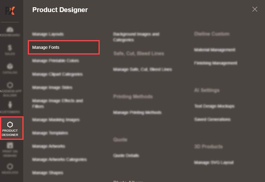 First, you must add and manage the different font styles to allow the customers to design the product using the text object. For that, go to the Product Designer → Manage Font. [2]