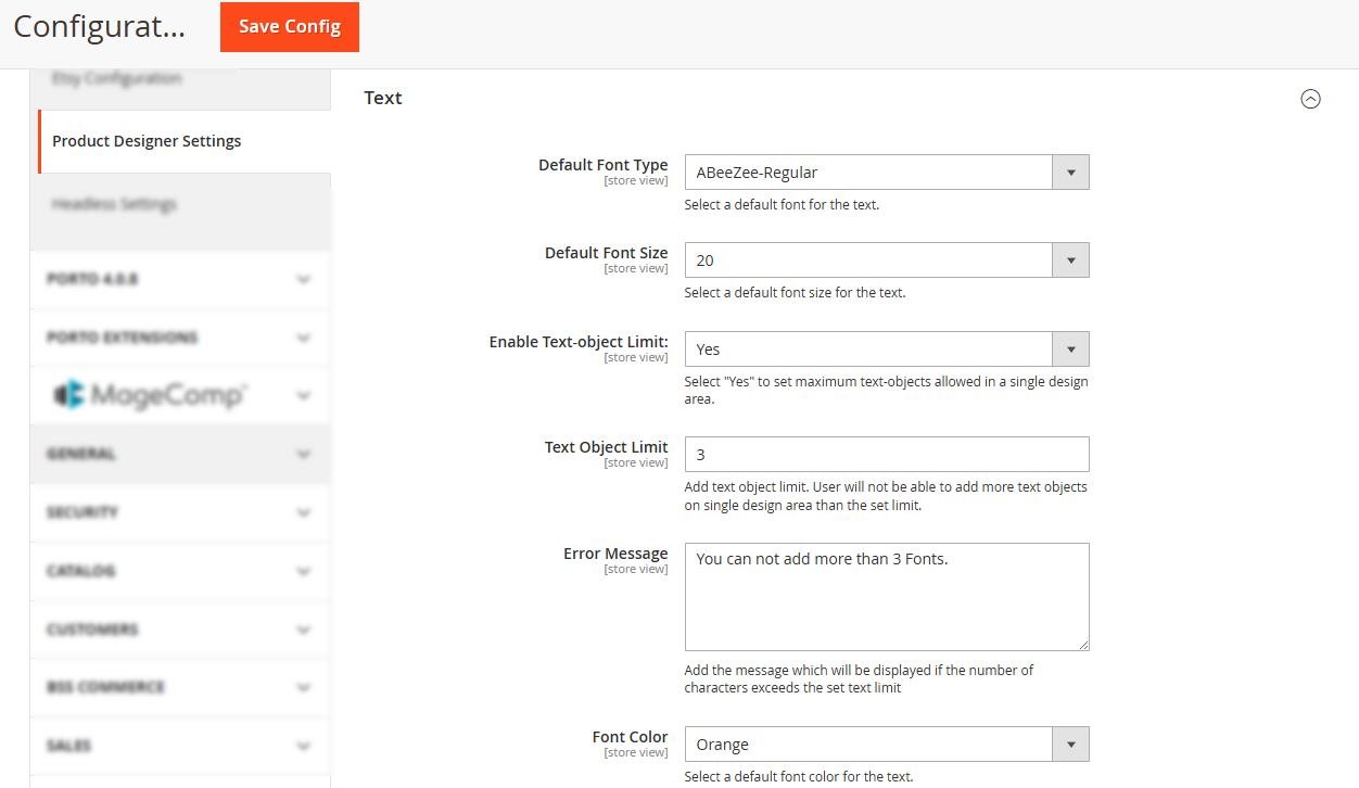 After inserting and managing the Font, you need to configure the default settings of the Text that will be displayed in the storefront. Go to Store → Configuration and then find the “Text Configuration” option from the “Product Designer Settings” page.