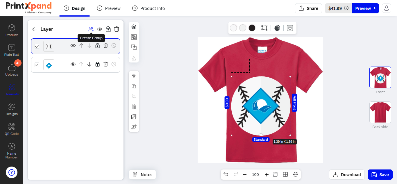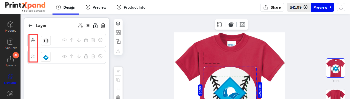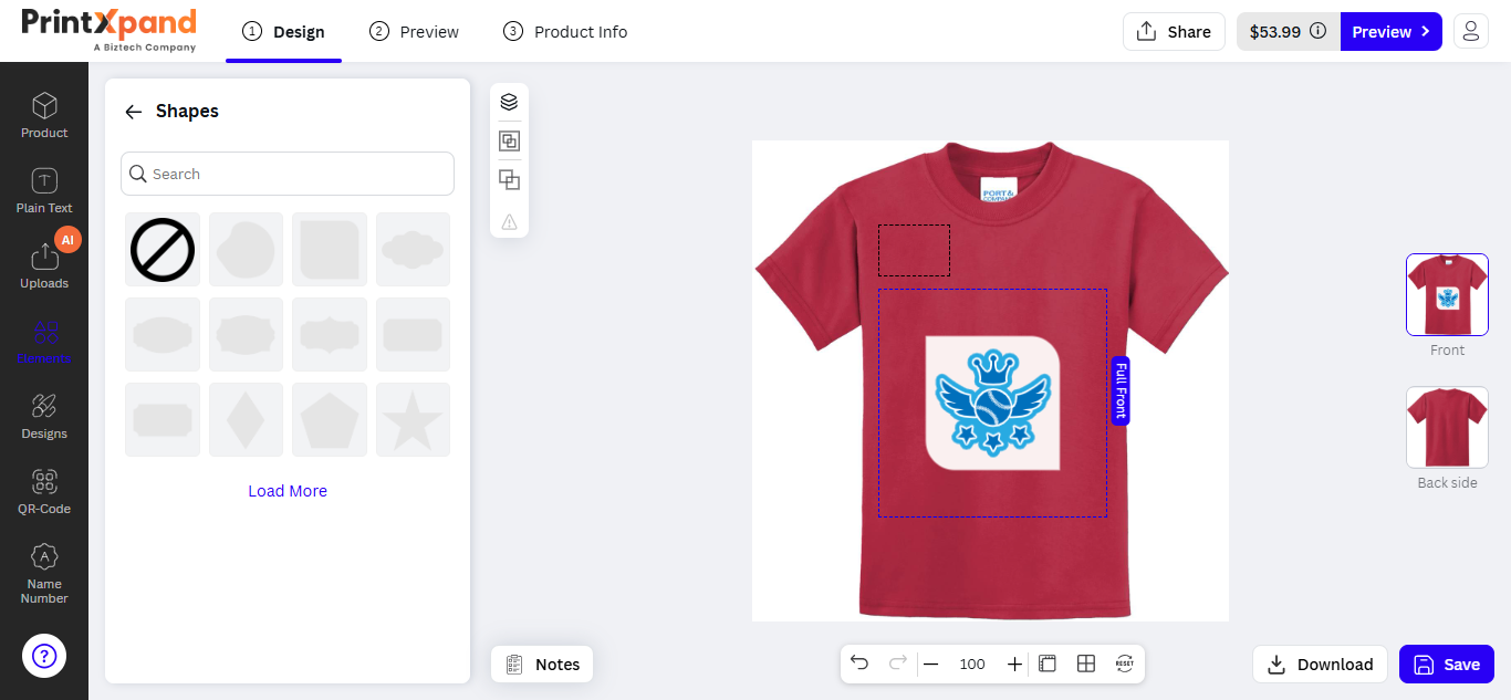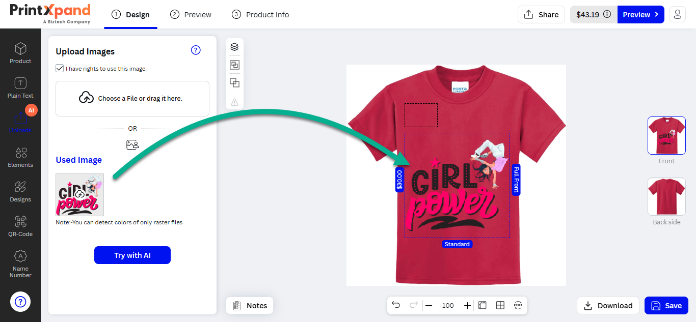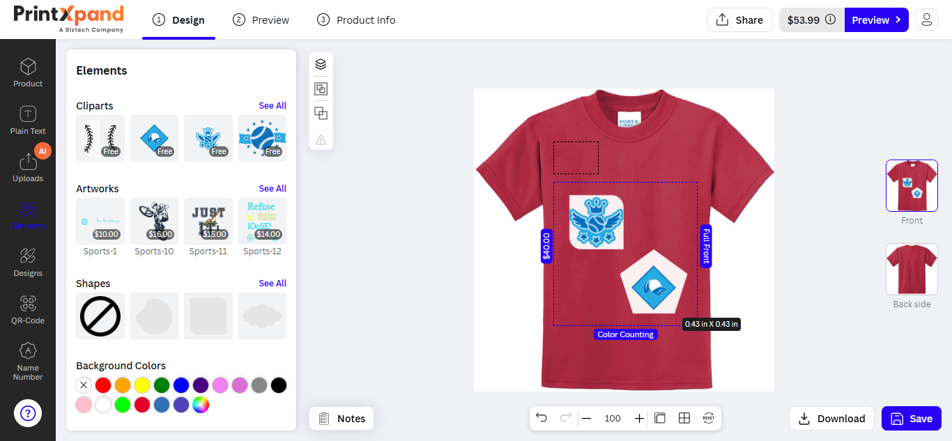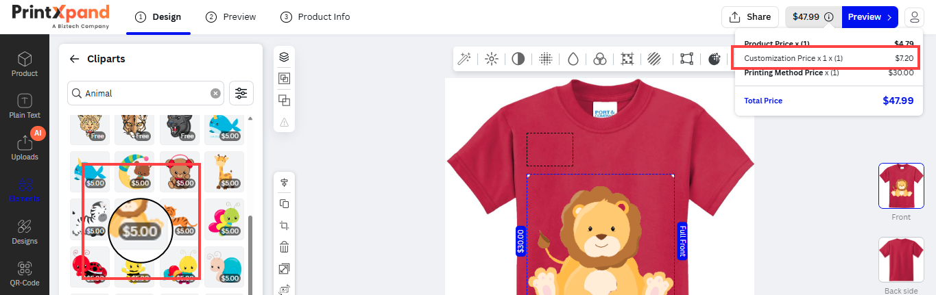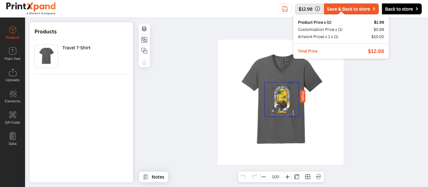 Our PrintXpand 4.0 Designer Tool provides unique text features for your customer to insert text objects on their choice of product (e.g. t-shirts, mugs, cards, etc.). Your customers can design and edit attractive text like multi-colored text, text-shadow, and other designer text styles.