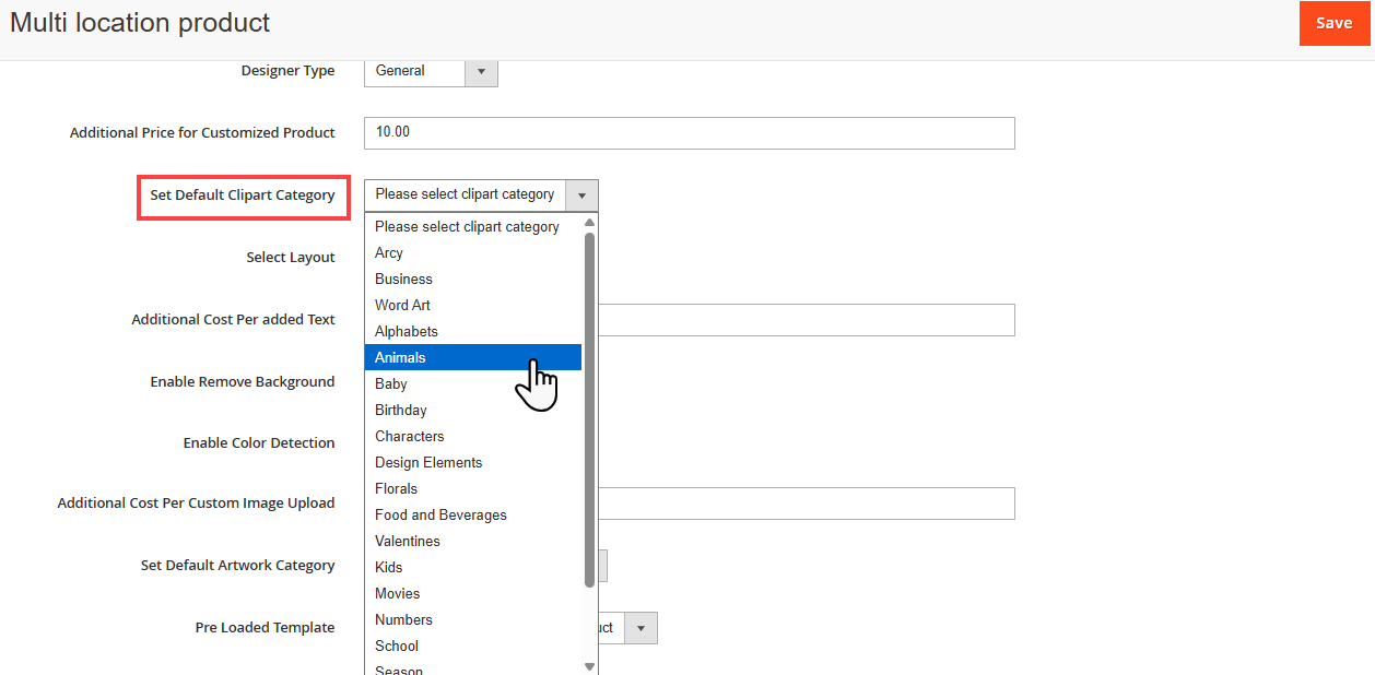 -Default Font Type: Select a default Font for the Text from this dropdown list. The text will appear in the default Font Type during Product designing in the front end.
