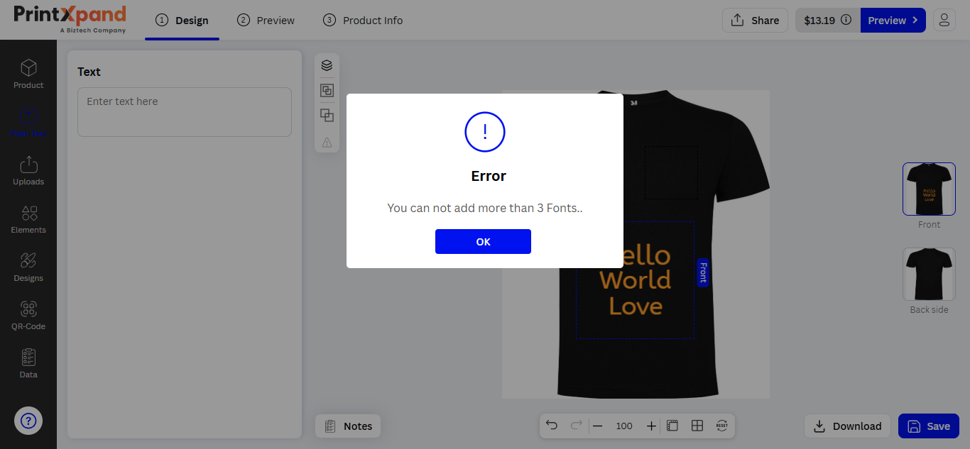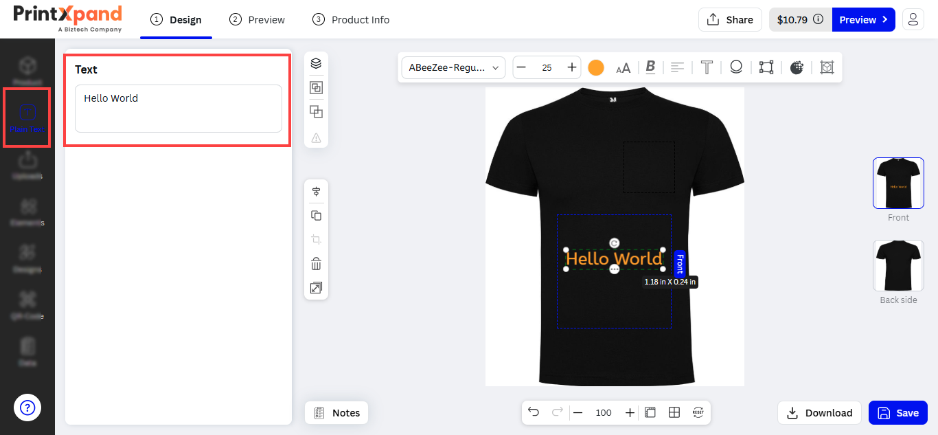 After managing the Font and configuring the default settings from the backend configuration, the customers will get the Text options to add to design the products. The customers can add the text objects by clicking on the Plain Text tab from the “Designing Explorer” panel.
