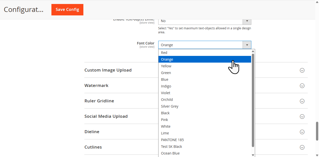 Font Color: Select the default “Font Color” to be selected for the Text objects that will be added to the designing area of the product. You will get the list of the colors as you have added the color from the “Manage Printable Colors”.